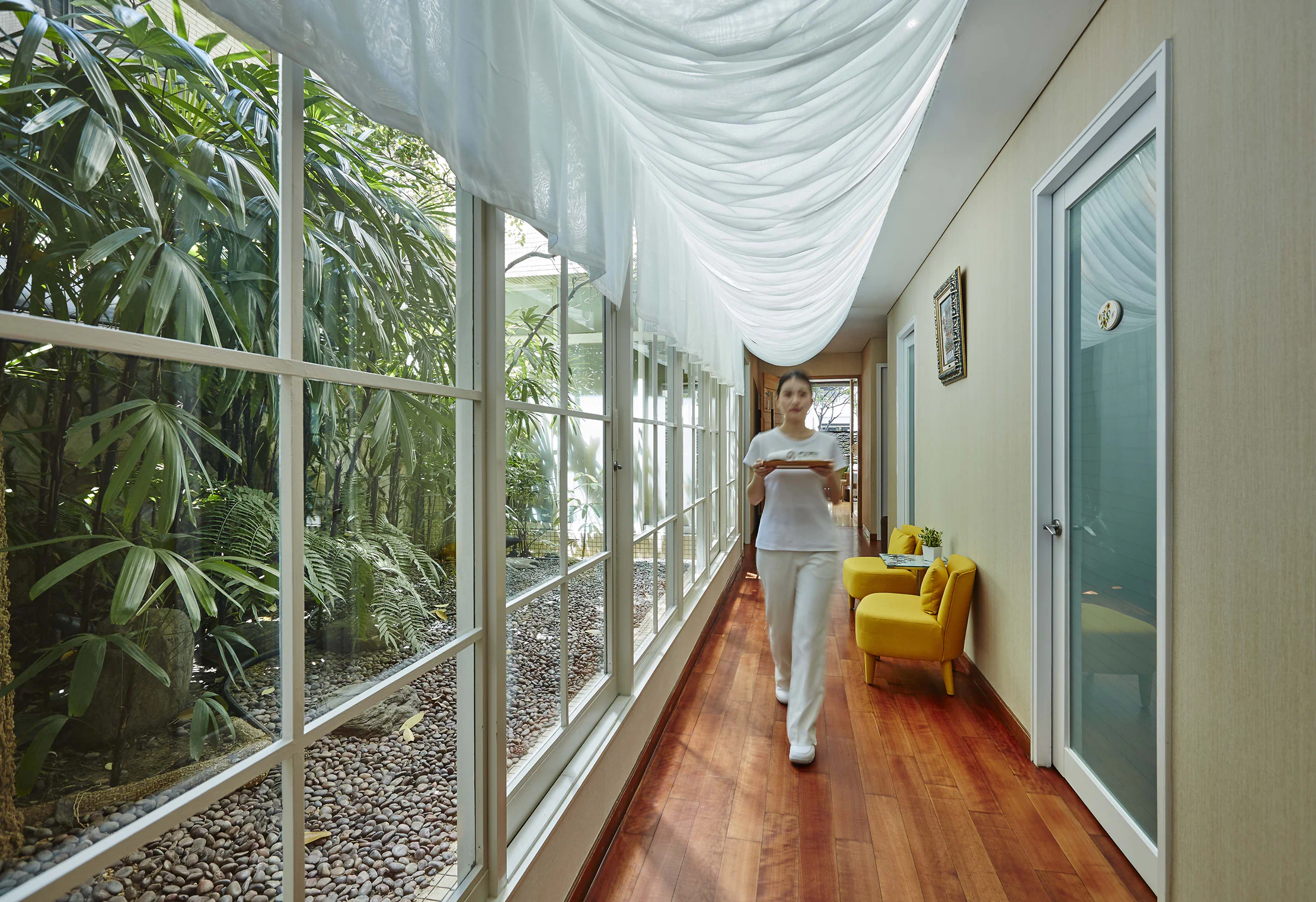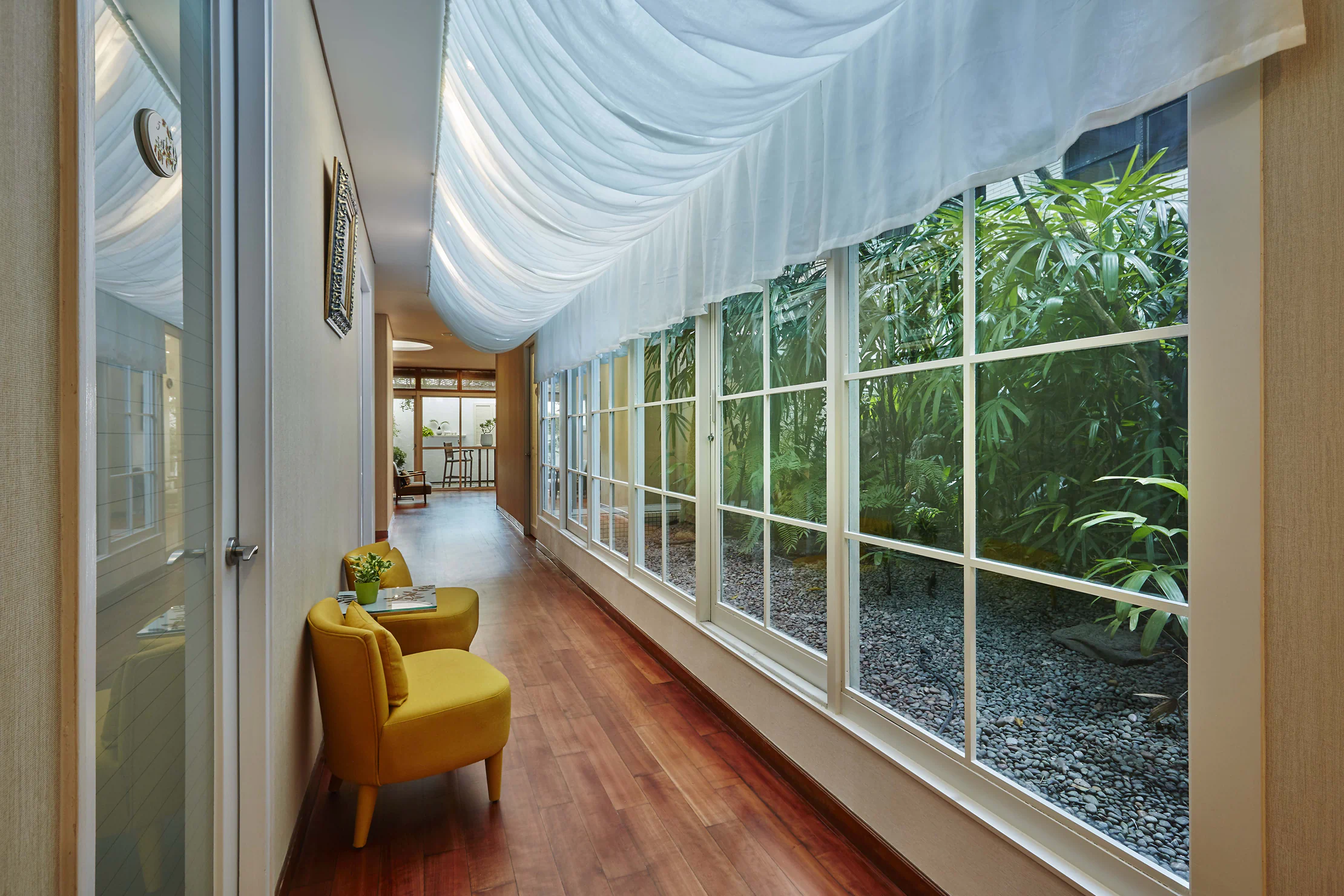 ,中央迴廊旁也有清新花園植栽,低調奢華的休憩環境,在都市中也能擁有度假的心情與感動。